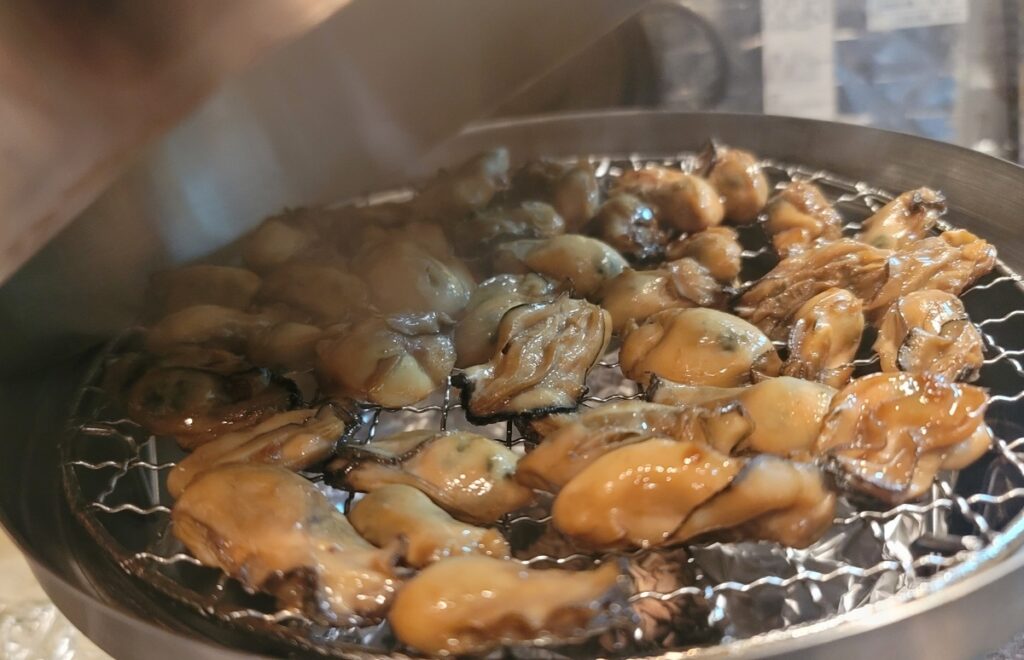 オイスターソースに煮絡めた牡蠣を軽く燻すステップです。コンロの火をつけて、ウッドチップが焦げて煙が立ち始めてからの5分程度で十分に燻製風になるので、「燻す」というよりは「焙る」というイメージに近いです。